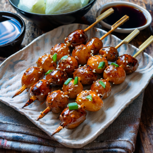 Waar rijst vaak de traditionele maaltijdbegeleider is van Aziatische gerechten, laten deze teriyaki spiesjes van krieltjes zien hoe veelzijdig de aardappel kan zijn. De zachte, romige bite van de krieltjes vormt een perfecte tegenhanger voor de volle umamismaak van de teriyakisaus.